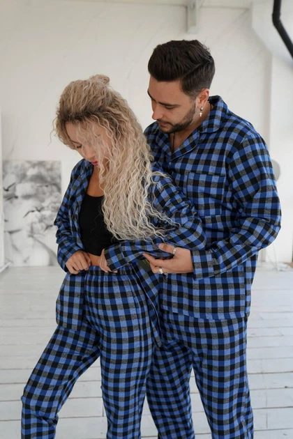 Парные две пижамы теплые комплект рубашка и штаны в клетку синие L от