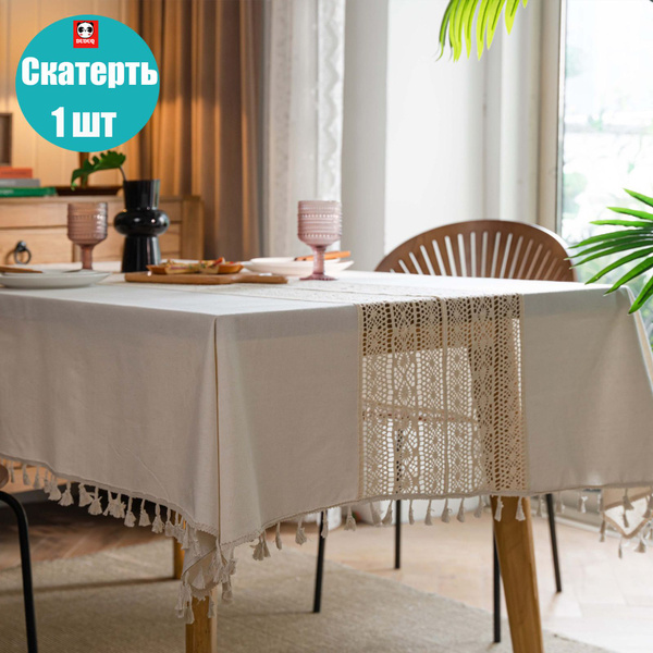 Скатерть из хлопка и льна, кружевная, с кисточками