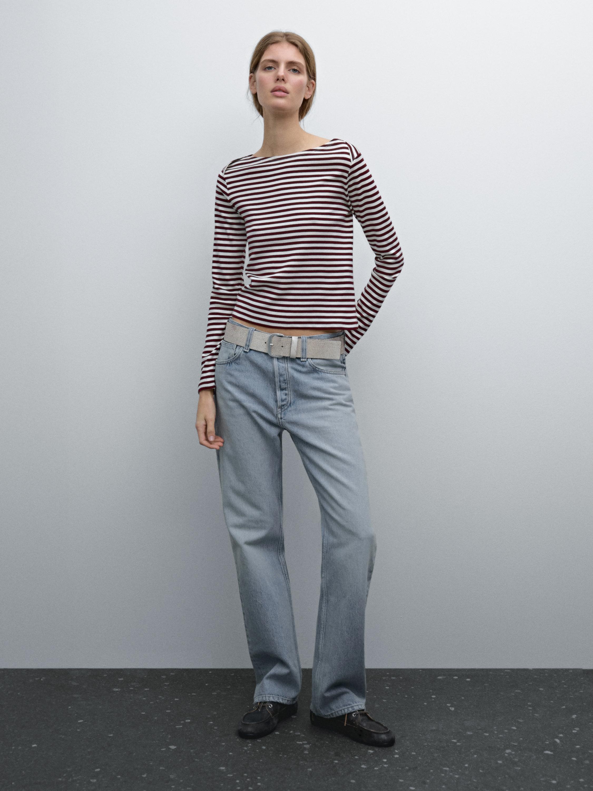 Футболка в полоску с деталью внахлест на плечах · Бургундский