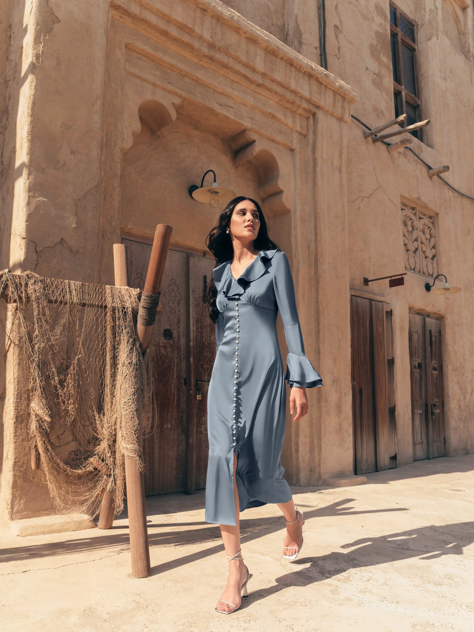 Атласное платье миди с воланами на воротнике и жемчужными пуговицами