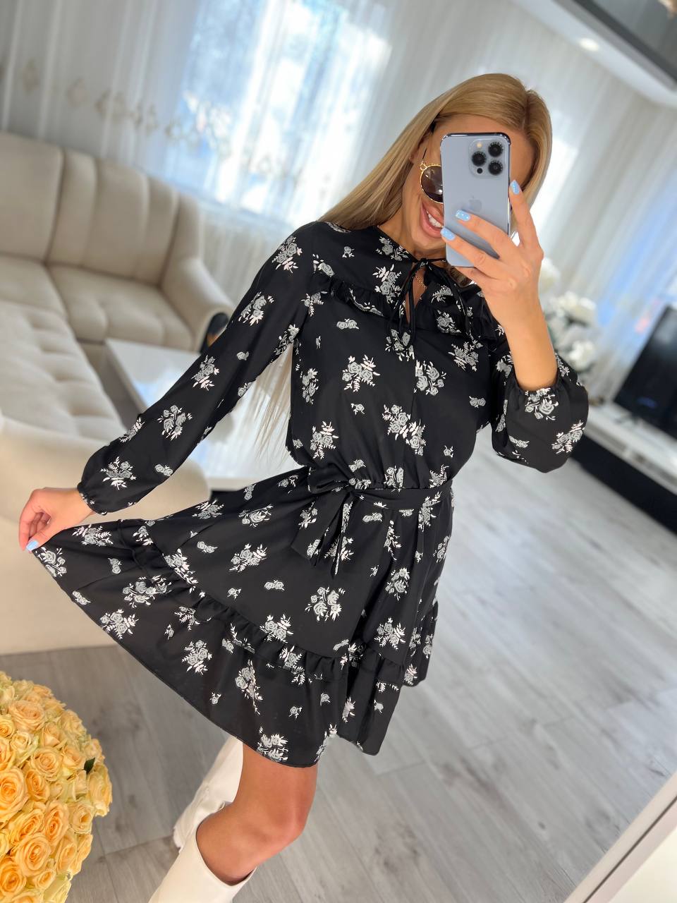 Красивое короткое женское платье свободного кроя в цветочек с длинным